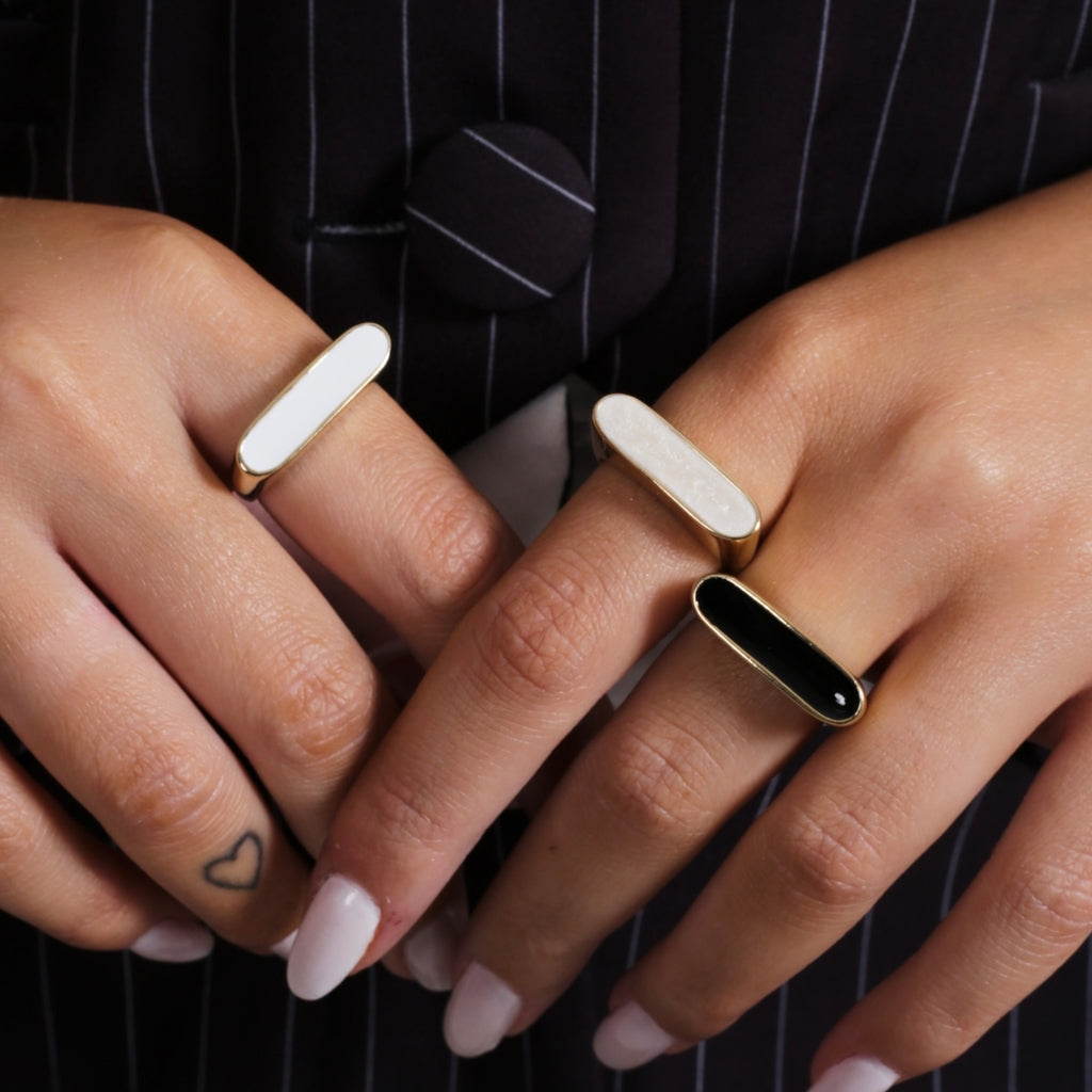 Com design contemporâneo e acabamento polido, este anel é realçado por uma faixa de resina preta, criando um contraste marcante e cheio de personalidade. Ideal para compor produções modernas, minimalistas e com atitude.