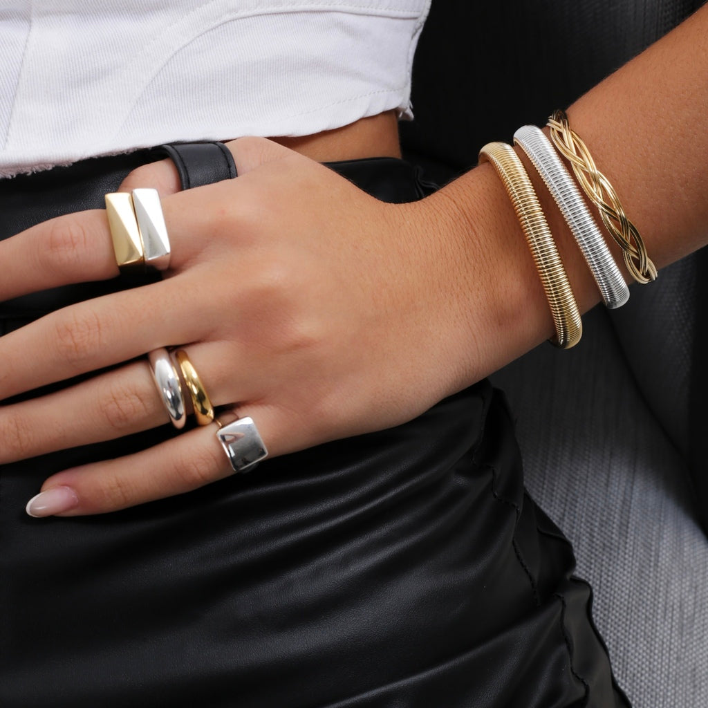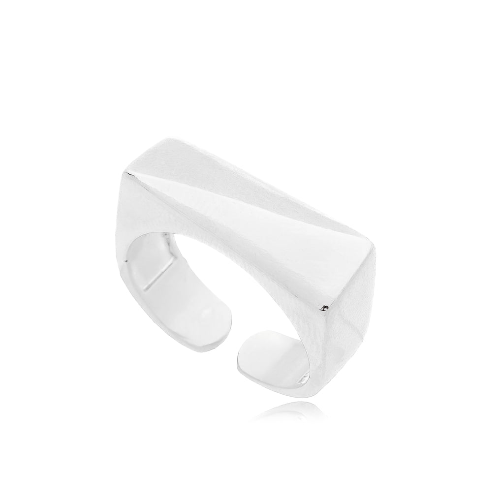 Com formato retangular facetado e acabamento polido, este anel traz uma estética moderna e imponente, perfeita para compor produções sofisticadas e contemporâneas.