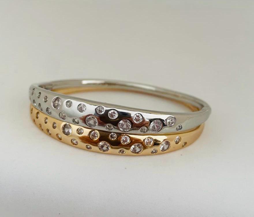 Este bracelete com estrutura rígida traz zircônias cravadas em tamanhos variados, criando um efeito de luz orgânico e sofisticado. Disponível em banho ouro e ródio, pode ser usado sozinho como destaque ou em dupla para um mix elegante e atemporal.