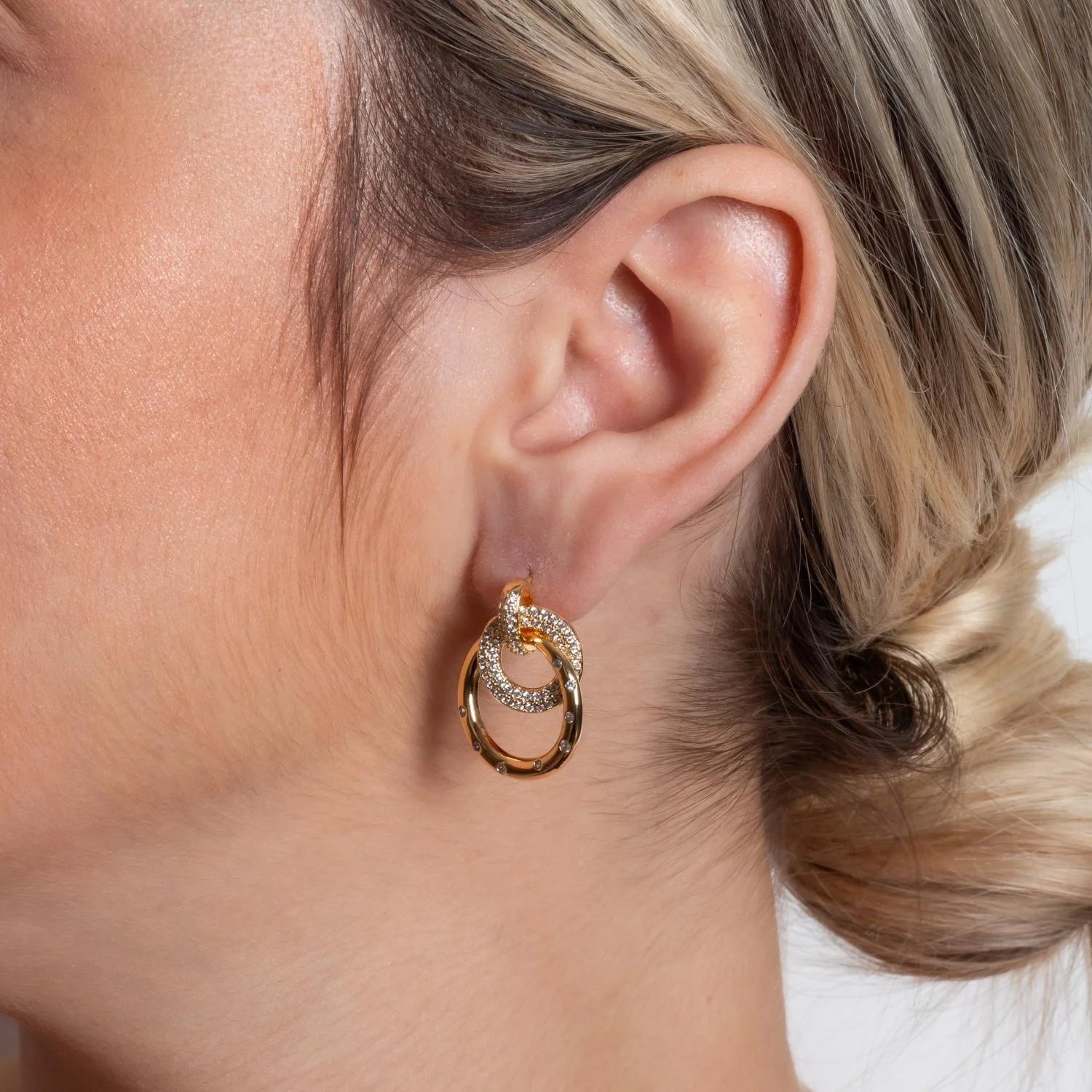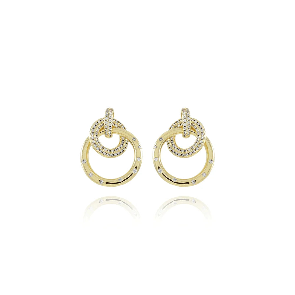 Composta por argolas entrelaçadas, esta peça combina o brilho das zircônias com a força do design geométrico. O banho em ouro realça o contraste entre o polido e o cravejado, criando um brinco moderno, leve e cheio de personalidade.