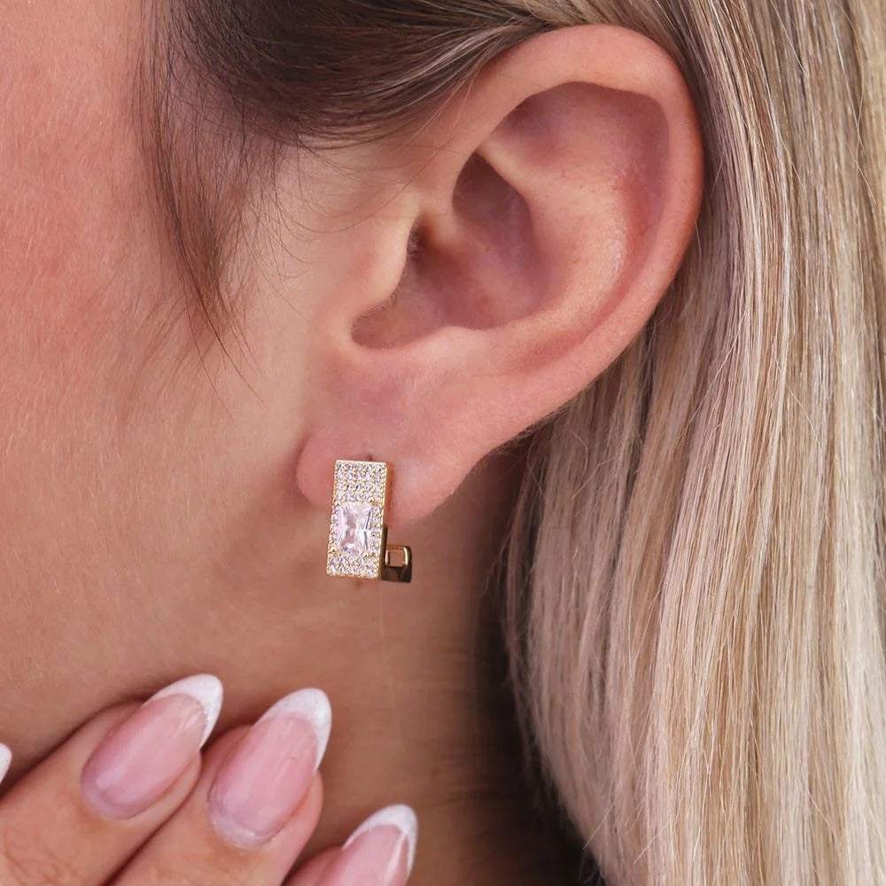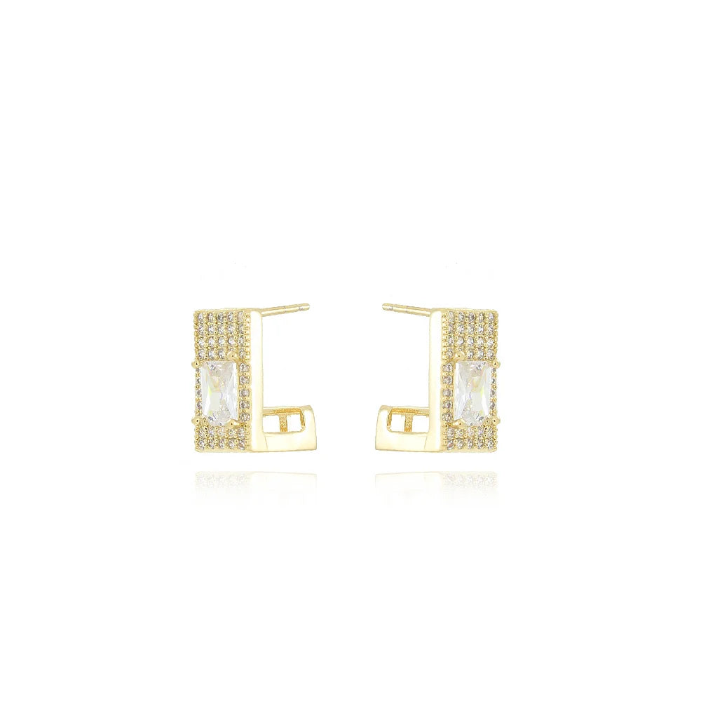 Com estrutura retangular e cravação minuciosa de zircônias, este brinco meia argola traz um design moderno e cheio de personalidade. A pedra central em corte retangular destaca a peça com um toque de elegância, perfeita para quem ama joias com leveza.