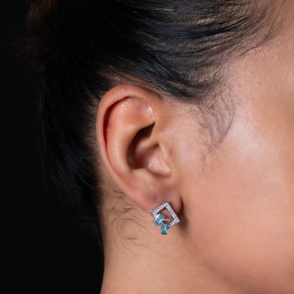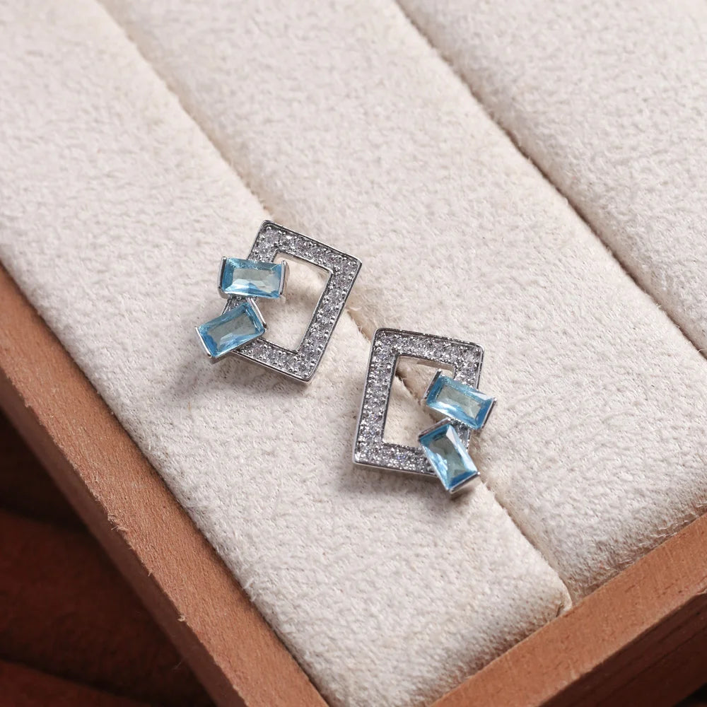 Com design retangular vazado, cravação de zircônias e ponto focal de dois cristais azul-claro retangular, essa peça traz um contraste moderno e elegante.