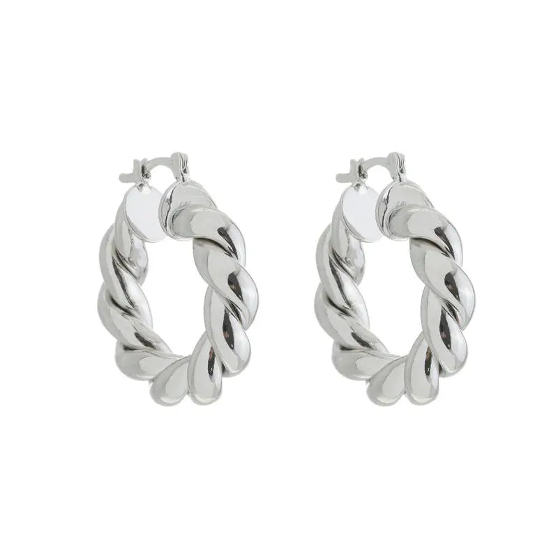 Com design torcido e acabamento polido em banho de ródio, este brinco é a união perfeita entre sofisticação e ousadia. Seu formato volumoso traz presença sem perder a leveza, enquanto o fecho italiano garante conforto e segurança no uso.