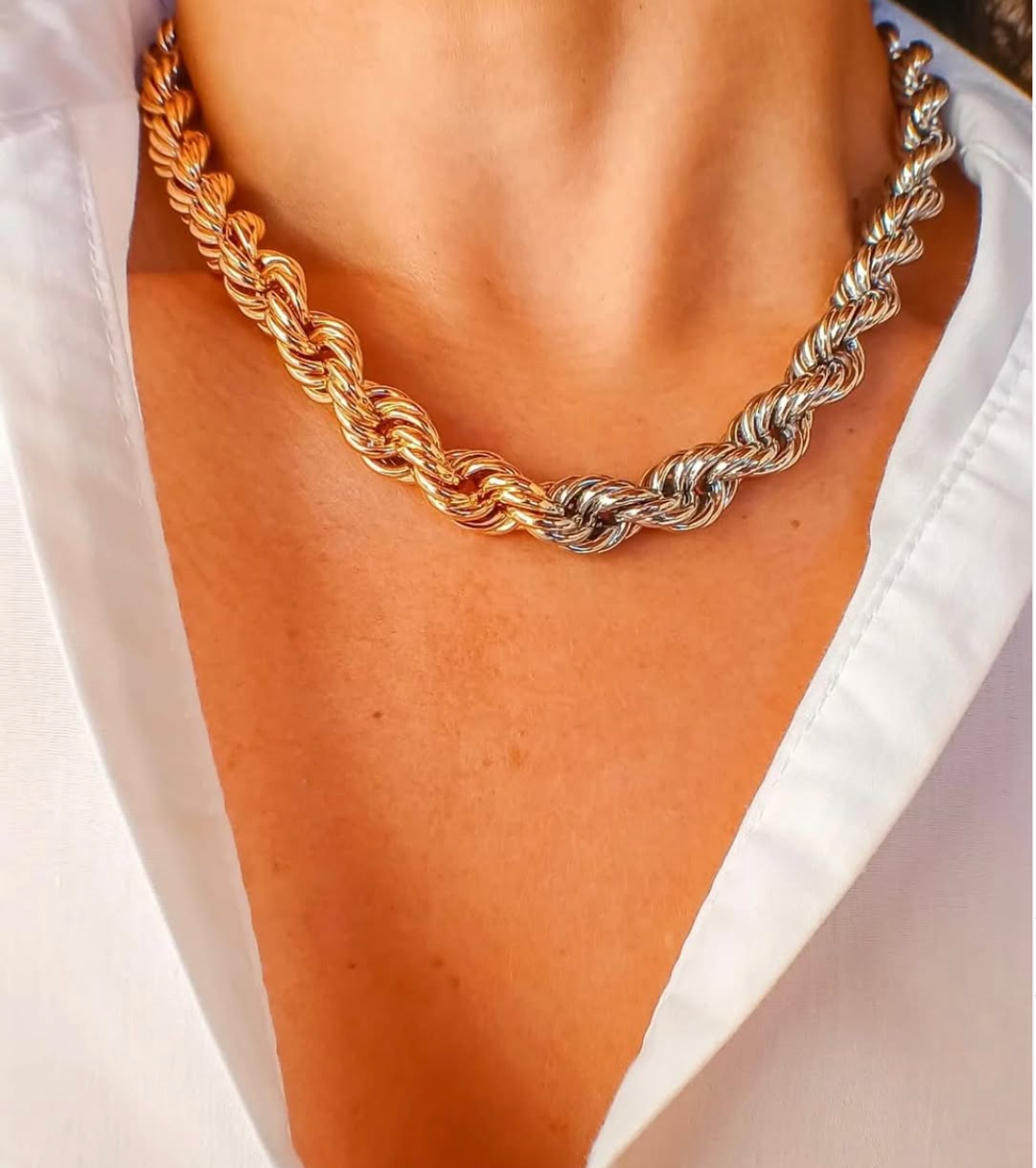 Com elos torcidos marcantes e visual bicolor em banho de ouro e ródio, o Colar Baiano Duo é uma peça imponente que une o clássico ao moderno. Ideal para mulheres que gostam de se destacar com elegância, ele transforma qualquer look com sua presença sofisticada e fashionista.