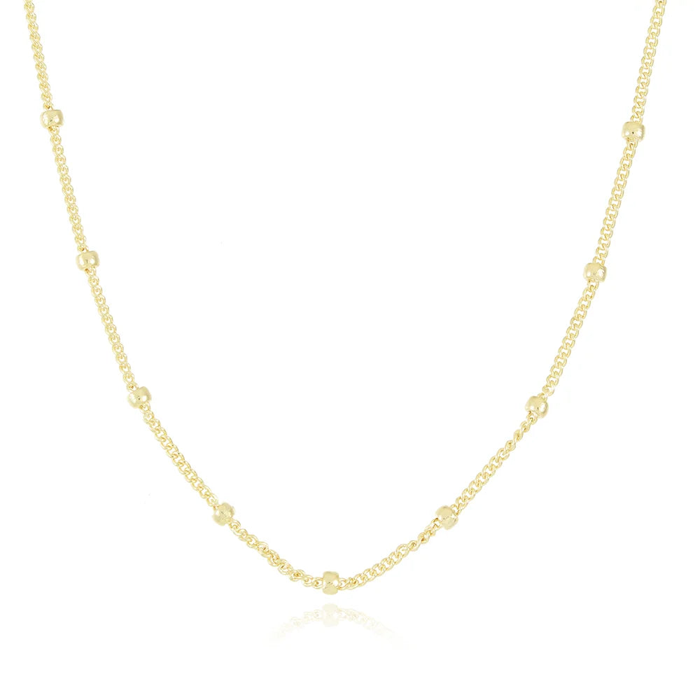 Com pequenos detalhes em bolinhas distribuídas ao longo da corrente, este colar traz leveza e charme à sua composição. O banho de ouro confere um brilho suave, enquanto o extensor oferece ajuste ideal para diferentes estilos e composições.